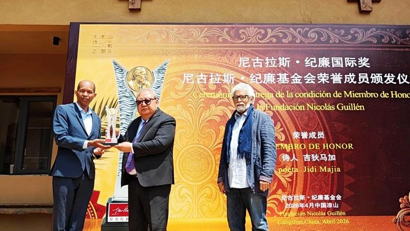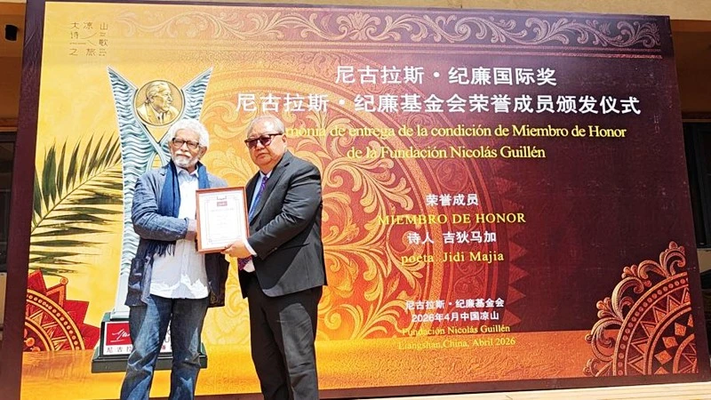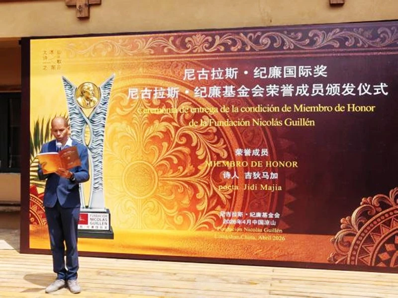 颁发仪式现场,亚厉克斯代表尼古拉斯·纪廉基金会授予吉狄马加荣誉会员称号时宣布:经基金会董事会审议决定,特授予您尼古拉斯·纪廉基金会荣誉会员称号,以表彰您为在中华人民共和国境内推广、传播尼古拉斯·纪廉的文学作品与精神遗产所作出的卓越贡献。作为中国当代极具影响力的代表性诗人,吉狄马加的作品深刻承载着古老彝族的精神文化内核,是民族文化与文学创作深度融合的典范。本次授予荣誉会员称号,既是对吉狄马加上述贡献的肯定,亦是对其艺术成就的高度认可。