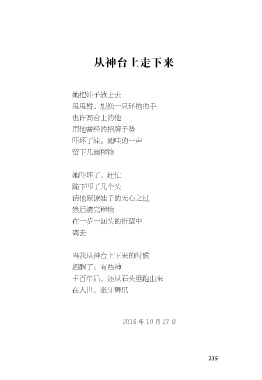 从神台上走下来 她把娃子放上去 甩甩臂,想换一只环抱的手 也许高台上的他 用他曾经的招牌手势 吓坏了娃。她哇的一声 留下几滴秽物 她吓坏了,赶忙 跪下叩了几个头 请他原谅娃子的无心之过 然后清完秽物 在一步一回头的祈望中 离去 当我从神台上下来的时候 酒醒了:有些神 千百年后,还从石头里跑出来 在人世,张牙舞爪 2016 年 10 月 27 日 235