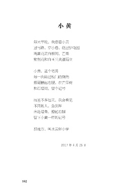 小 黄 每天早晚,我牵着小黄 过马路,穿小巷,绕过伊电园 鸡蛋花黄白相间,芒果 紫荆花和白玉兰夹道而立 小黄,这个宅男 每一次转过校门的侧角 都要撩起右腿,在芒果树 和石墙间,留个记号 而差不多每天,我会看见 不同的人,急刹车 奔赴墙角,撩起右腿 留下小黄一样的记号 那地方,叫水云轩小学 2017年4月26日 102