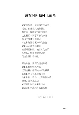蹲在时间枝桠上的鸟 它们沉默着,这些消失的森林 毛发,脱落的皮肤和骨头 和晚霞一样隐藏起来的剑光 这些已经长满了青苔的事物 被水平线抹平的创口 疼痛和细流小溪一样的悲伤 它们常常在午夜醒来 被折断的树枝,被落水的青果 所惊醒。短暂的惊扰之后 是更加深沉的静默 万物如谜,云团在慢慢靠近 它们的翅膀悄无声息 远行者露出他石头一样的鼻梁 石匠们从石头里挣脱出来 他们和树上的鸟,这即将到来的 欣喜。是多么慈悲 它把我们从石头里救出来 它让我们从此拥有铁石心肠 2017年5月23日 117