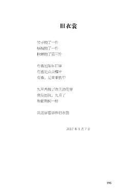 旧衣裳 竹子脱了一件 梧桐脱了一件 秋蝉脱了第三件 有些是陈年旧事 有些是点点鳞片 有些,是重重铁甲 九里香脱了昨天的花萼 我很固执,九月了 和紫荆树一样 我还穿着那件旧衣裳 2017年9月7日 195