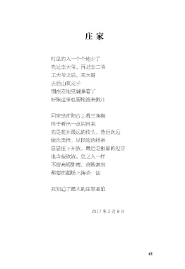 庄 家 村里的人一个个地少了 先是李大爷,再是李二爷 王大爷之后,秦大哥 去后山收麦子 倒在麦地里就睡着了 好像这事也要轮流来做庄 回家坐在阳台上看三角梅 终于看出一点眉目来 先是花开最远的枝头,然后次远 依次类推,从顶端的枝条 层层往下开放,最后是根部的短芽 也含苞欲放。总之人一样 不管高矮胖瘦,贫贱富贵 都要在疆场上搏杀一回 我知道了最大的庄家是谁 2017年2月8 日 41