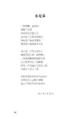 小兄弟 三棵辣椒,盆栽的 就像三兄弟 在互相竞争着长大 老大老二长得身高体壮 唯有老三躲在角落里 瘦骨伶仃地像营养不良 老大老二开花了结仔了 隔壁家的大狗二狗结婚了 一串串辣椒陆续地挂出来 老三依然不语,沉默着 那天,在珠海打工的何三狗 从脚手上掉了下来 参加完他的送行仪式回来后 我看见老三这颗小辣椒 挂出了两粒子弹大的果子 2017年2月13日 44