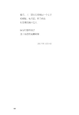 腊月,王二哥从石场领回一个女子 杨柳腰,弯月眉,样子妖冶 村里都说她不是人 同学们都听说了 王二哥娶的是柳树精 2017年3月9日 64