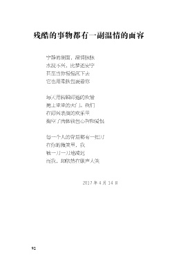 残酷的事物都有一副温情的面容 宁静的湖面,温情脉脉 水波不兴,比梦还安宁 甚至当你慢慢沉下去 它也用柔软包裹着你 每天用转瞬即逝的欢愉 掩上重重的大门。我们 在即兴表演的欢乐里 掏空了肉体钱包心智和爱恨 每一个人的背后都有一把刀 在你的微笑里,我 被一刀一刀地凌迟 而我,却依然在纵声大笑 2017年4月14日 92