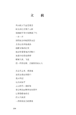 立 秋 外面的天气还是酷暑 时光却已走到了立秋 梧桐的年华开始飘落了吗 一片一片 田野的青纱帐默默无语 是否已经开始成熟 捻断鬓角的白发 把韶华紧紧地捂在胸口 池塘中的荷花婷婷 蜻蜓飞来,飞走 任一阵阵凉雨,打湿淡然的心头 从春天走来,孤独地 站在这盛衰的街口 我不回望 也无法抹平 走过的每一道折皱 青春啊美丽啊所有的芳华 让你静静地带走 任天空映照 一湾河水独自的漂流 130