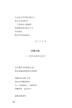 行走在太平洋的东海岸上 穿云而过的阳光 一下把我的心胸刺穿 我的脚步再也停不下来 任由海风 把它吹得很远很远 2017.12.22. 晨 成佛大道 ——佛光山佛陀纪念馆 走在佛光寺的成佛大道上 我在虔诚地度量和它的距离 成佛大道宽阔 平坦 就连台阶都很舒缓 每一个朝佛的人,轻轻松松 向佛叩拜,毫不费力 建筑却很现代 180