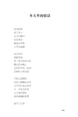 冬天里的情话 你的距离 留了多少 思念的脚印 你的笑容 激荡过无数 心里的涟漪 思念你时 就寂寞地 写一段含愁的记忆 翻过的诗稿上 有你的声音、眼泪 我憔悴了的忧郁 不管走到哪里 我的心都躺在这里 春天来时就会发芽 开一朵带火的花 让月亮的香味 摇着斑斓的彩翼 就为了让你 261