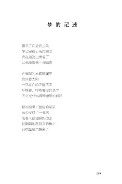 梦的记述 飘来了白昼的云朵 梦是安在云朵的翅膀 我在翅膀上睡着了 云朵浸染我一身幽香 在璀璨的星辉斑斓里 我沐着太阳 一只洁白的天鹅飞来 呼唤着,呼唤着你的名字 天空变成你清风缥缈的裙衫 裙衫缀满了银色的星星 云朵变成了一张床 随着天鹅翅膀的翕张 轻飘飘地落到我的褥下 我在温暖里醒来了 269