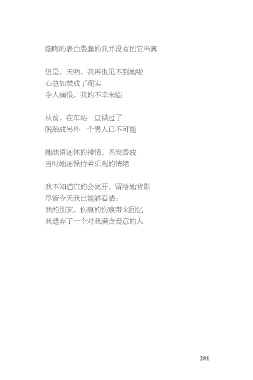 隐晦的表白愚蠢的我并没有把它当真 但是,天呐,我再也见不到她啦 心急如焚成了现实 令人痛恨,我的不幸来临 从前,在车站一旦错过了 脱胎成另外一个男人已不可能 她欲语还休的神情,秀发香波 当时她还保持着乐观的情绪 我不知道真的会离开,留给她背影 尽管今天我已能够看清: 我的朋友,伤痕的伤痕带来回忆 我遗弃了一个对我满含爱意的人 281